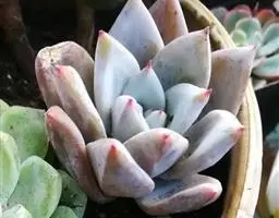 小红衣是景天科、拟石莲花属的一种多肉植物。叶片匙形,扁平细长,叶表具白粉,有明显的半透明边缘,…