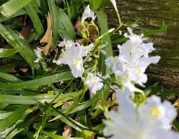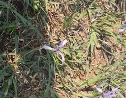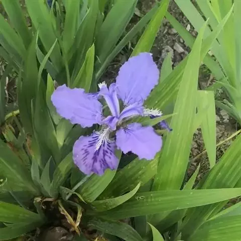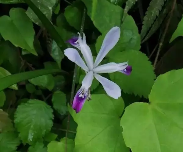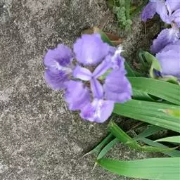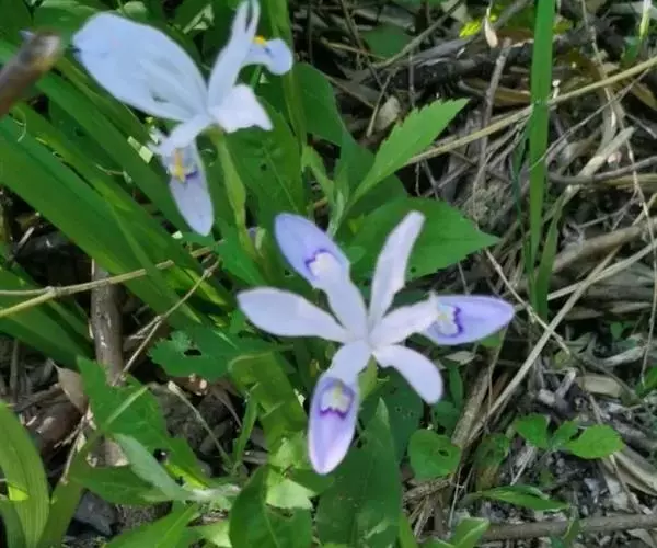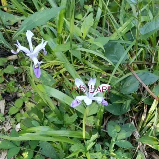 小花鸢尾(学名:Iris speculatrix Hance):多年生草本,植株基部围有棕褐色的老叶叶鞘纤维及披针形的鞘状叶。根状茎二歧状分枝,斜伸,棕褐色;根较粗壮,少分枝。叶略弯曲,暗绿色,有光泽,剑形或条形,有3-5条纵脉。花茎光滑,不分枝或偶有侧枝,有1-2枚茎生叶;苞片2-3枚,草质,绿色,狭披针形,内包含有1-2朵花;外花被裂片匙形,有深紫色的环形斑纹,内花被裂片狭倒披针形,直立。蒴果椭圆形,顶端有细长而尖的喙;种子为多面体,棕褐色,旁附有小翅。花期5月,果期7-8月。