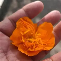 (2)宽瓣金莲花 花皱缩,湿润展平后,直径2.5-4.8cm;萼片10-20,橙黄色,宽椭圆形或倒卵形,长1-2.2cm,宽0.6-1.7cm,全缘或先端有不整齐小齿;花瓣18-22棕色,匙状线形,与萼片等长或稍短;雄蕊多数;于房多数,聚合,花柱短尖。气微,味苦。