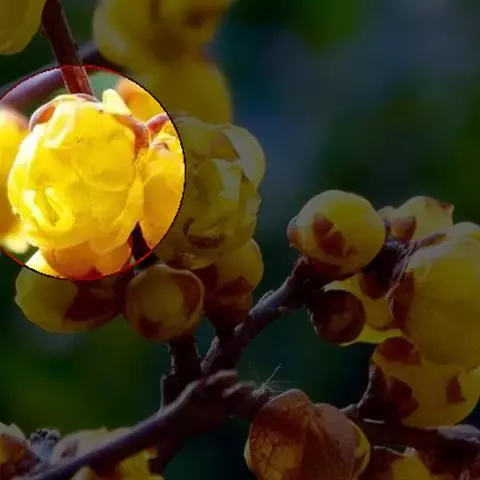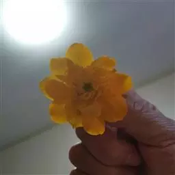 (4)短瓣金莲花 花皱缩,湿润展平,直径3.3-5.5cm;萼片5-8,黄色,外层椭圆状卵形,其他倒卵形,长1.2-2.8cm,宽1-1.5cm,先端有少数不明显小齿;花瓣10-22,棕色,线形,长1.3-1.5cm;雄蕊多数;子房约22个聚会,花柱短尖,棕黄色。气微香,味苦。