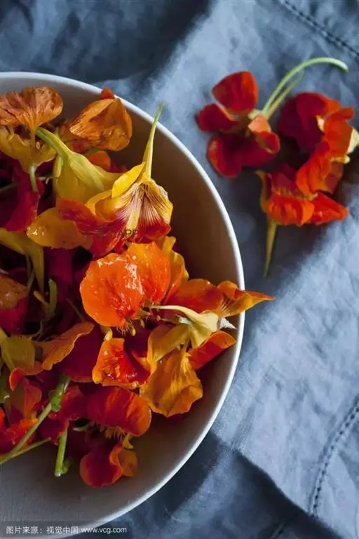 其味辛辣,嫩梢、花蕾、新鲜种子可作为食品调味料。绿色种荚可腌制泡菜,脆嫩可口,微辣甘甜。干花可制成金莲花茶供饮用。花和鲜嫩叶可入色拉莱生食,叶子多少有点异味,但煮后味道很好。未熟的叶有辛辣味,作香辛料使用或用于泡菜。茎、叶、果实均含有精油,叶中富含维生素和铁,味微辛能健胃,还对胃溃疡和坏血病有效。