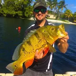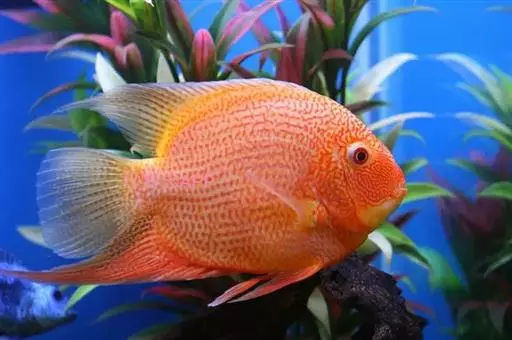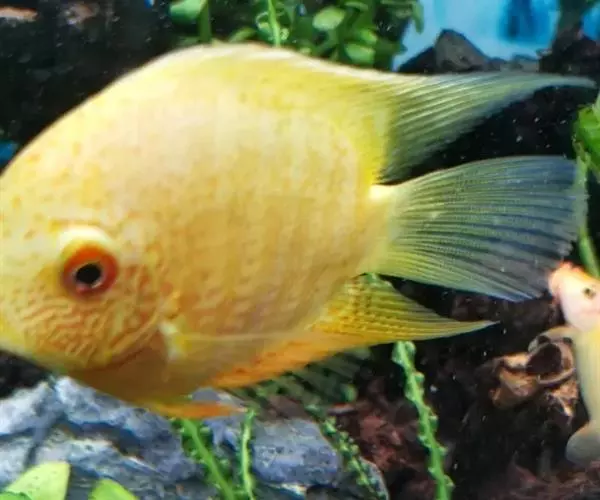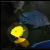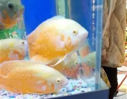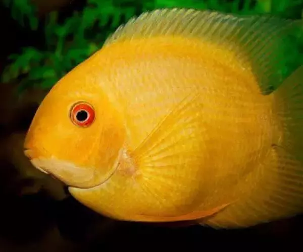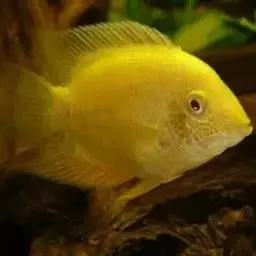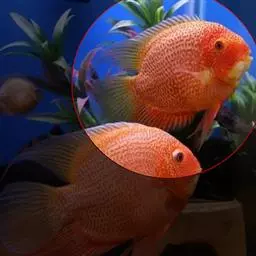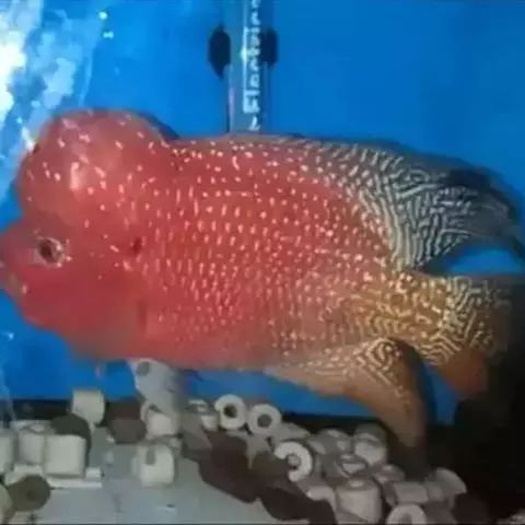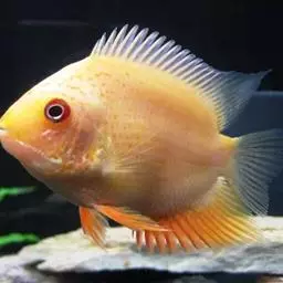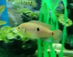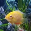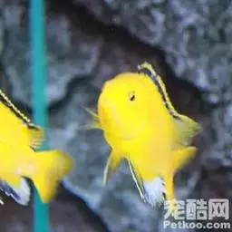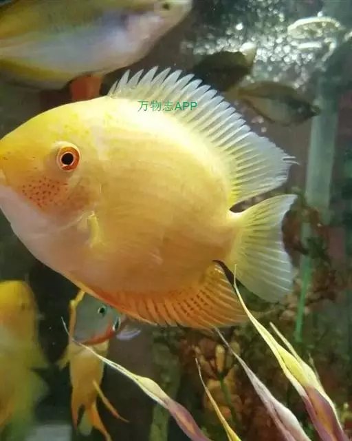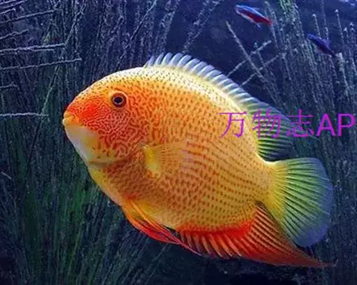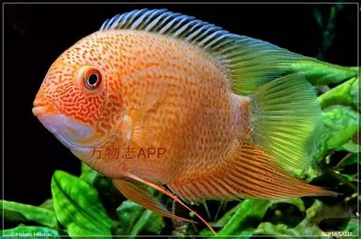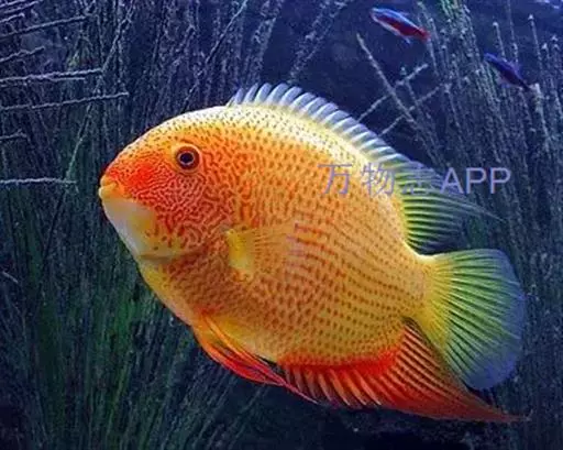 金菠萝鱼,Cichlasoma severum,慈鲷科丽体鱼属。成鱼体长20~25cm,厚侧扁形,侧面观椭圆形,口裂较小,体色为橙色,鳃盖上布满红色小点,喜欢弱酸性至中性水质,适宜水温25~30℃,偏动物性的杂食性,喜欢底栖无脊椎动物如水蚯蚓、摇蚊幼虫之类,主要分布于巴西、圭亚那境内,亚马逊流域。