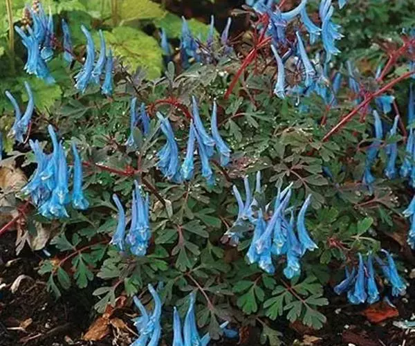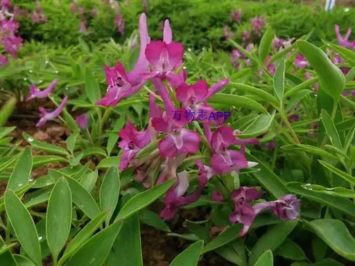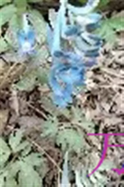 花:总状花序疏生5-15花。苞片披针形或狭卵圆形,全缘,有时下部的稍分裂,长约8毫米。花梗花期长约1厘米,果期长约2厘米。花紫红色。萼片小,早落。外花瓣宽展,具齿,顶端微凹,具短尖。上花瓣长(1.5-)2-2.2厘米,瓣片与距常上弯;距圆筒形,长1.1-1.3厘米;蜜腺体约贯穿距长的1/2,末端钝。下花瓣具短爪,向前渐增大成宽展的瓣片。内花瓣长8-9毫米,爪长于瓣片。柱头近圆形,具较长的8乳突。