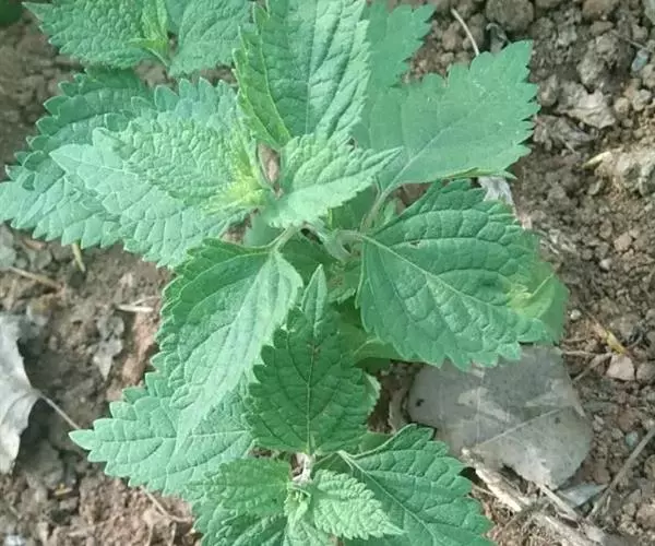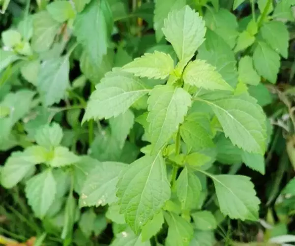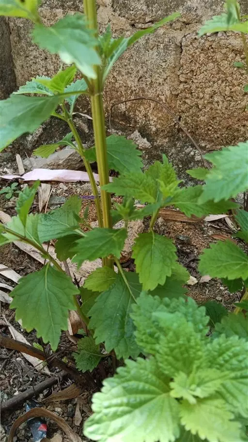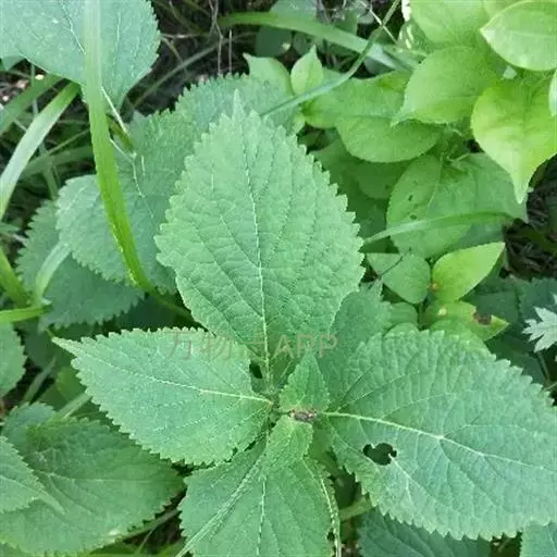 茎呈方柱形,上部多分枝,长20-50cm,直径约2mm;表面灰绿色或灰棕色,四面凹下成纵沟,密被倒向的柔毛;质脆易折断,断面木部窄,黄棕色,髓部大,白色。叶对生,灰绿色,多皱缩,破碎,完整叶片展平后呈卵形,卵状披针形,长3-7cm,宽1.5-4cm,边缘具粗锯齿,先端渐尖,基部楔形,两面有柔毛;叶柄长0.2-2.5cm。气微,味苦。
