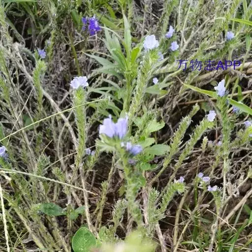 二年生草本。茎高达100厘米,有开展的长硬毛和短密伏毛,通常多分枝。基生叶和茎下部叶线状披针形,长可达12厘米,宽可达1.4厘米,基部渐狭成短柄,两面有长糙伏毛;茎上部叶较小,披针形,无柄。花序狭长,花多数,较密集;苞片狭披针形,长4-15毫米;花萼5裂至基部,外面有长硬毛,裂片披针状线形,长约6毫米,果期增大至10毫米;花冠斜钟状,两侧对称,蓝紫色,长约1.2厘米,外面有短伏毛,檐部不等浅裂,上方1个裂片较大;雄蕊5,花丝长1-1.2厘米,花药短,长圆形,长约0.5毫米;花柱长约1.4厘米,顶端2裂,柱头顶生,细小。小坚果卵形,长约2.5毫米,表面有疣状突起,着生面居果的基部。