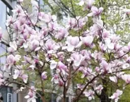 二乔木兰(学名:Magnolia soulangeana Soul.-Bod.)是木兰科木兰属植物,落叶小乔木,高可达15米。叶倒卵形或宽倒卵形,先端宽圆,下面具柔毛。花先叶开放,花期3月,钟状,外面淡紫色,内面白色。萼片三片,似花瓣状,长度为花瓣之半或近等长,有时绿色。聚合果长约8厘米,直径约3厘米;蓇葖卵圆形或倒卵圆形;种子深褐色,宽倒卵圆形或倒卵圆形,侧扁。花期2-3月,果期9-10月。