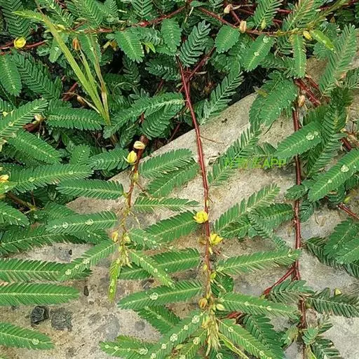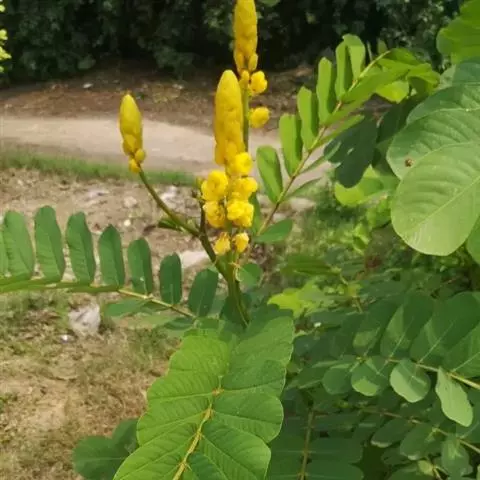 一年生草本,株高30-60厘米,稍有毛,分枝或不分枝。叶长4-8厘米,有小叶8-28对,在叶柄的上端有黑褐色、盘状、无柄腺体1枚,;小叶长5-9毫米,带状披针形,稍不对称。花生于叶腋,有柄,单生或2至数朵组成短的总状花序;萼片5,分离,外面疏被柔毛;花瓣5,黄色;雄蕊4枚,有时5枚;子房密被短柔毛。荚果扁平,有毛,开裂,长3-8厘米,宽约5毫米,有种子6-12粒;种子扁,近菱形,平滑。