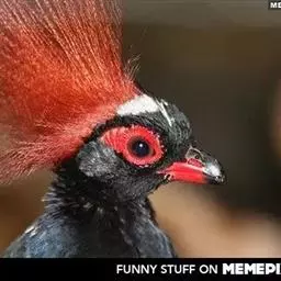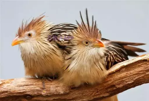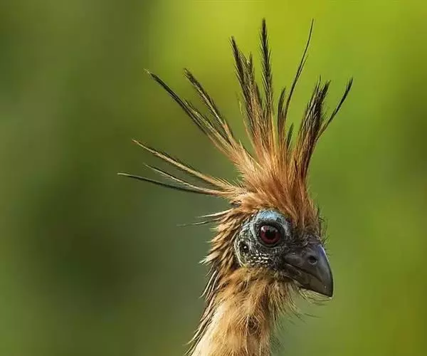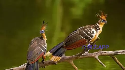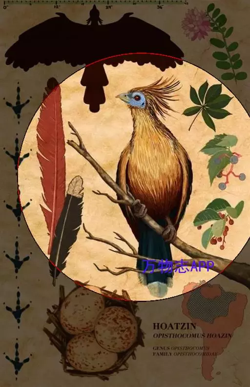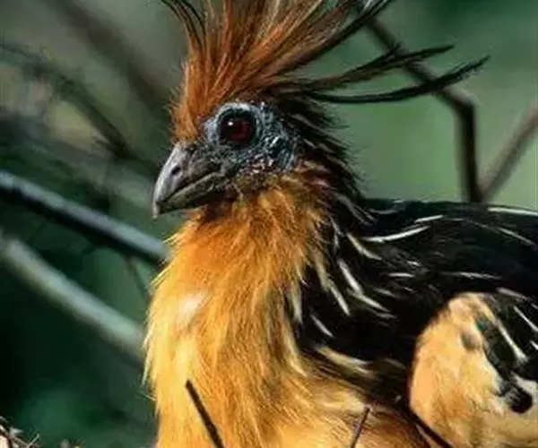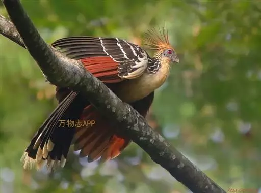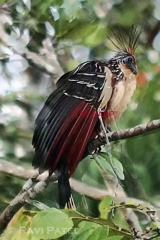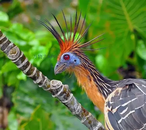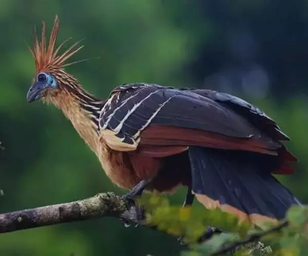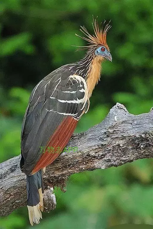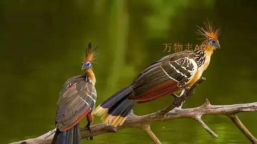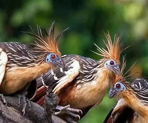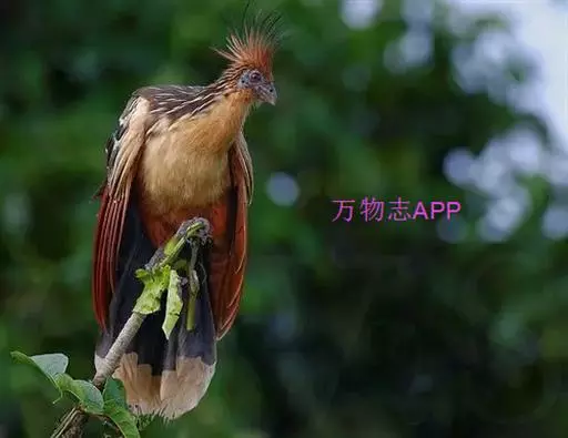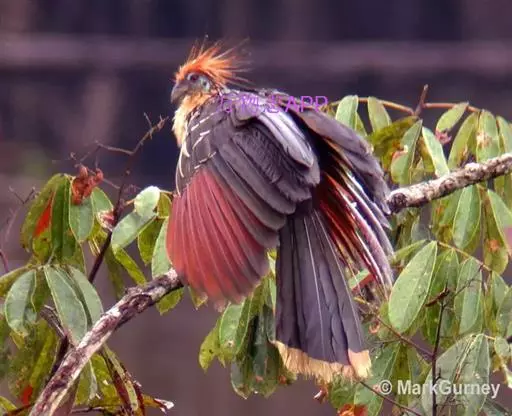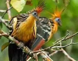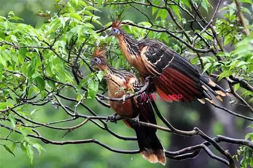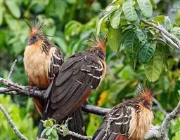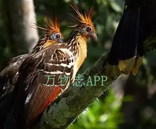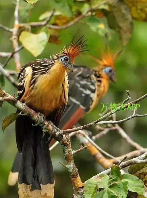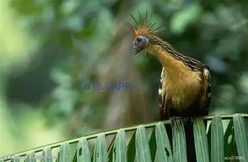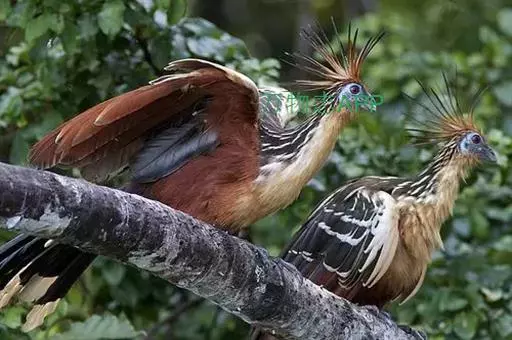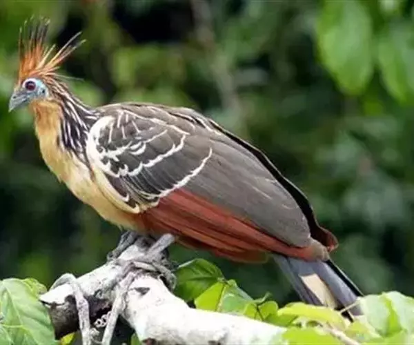 麝雉(学名:Opisthocomus hoazin):体长约65厘米,体重不及1 千克。雌雄相似,头上有由长短不一的羽毛组成的羽冠,身体背部有带白色条纹的棕色羽毛,尾羽和靠近尾部的后腹部羽毛是土红色的,而前胸则是奶黄色的。它的脸呈天蓝色。麝雉嗉囊极大,分为两部分,用于贮存和消化海芋属植物有弹性的叶子,那是它主要的食物来源。由于麝雉身体里散发出一种浓烈的霉味,因此才称作麝雉(Stinkbird)。