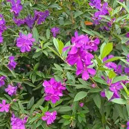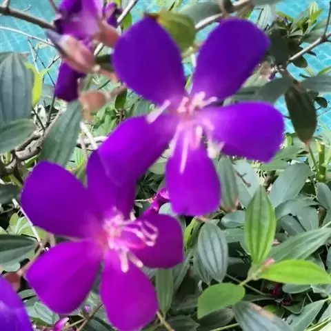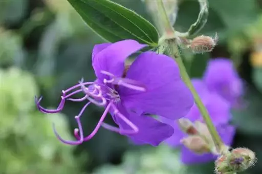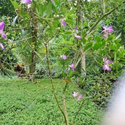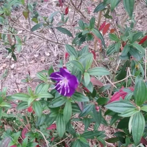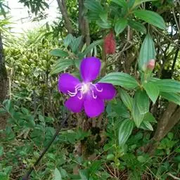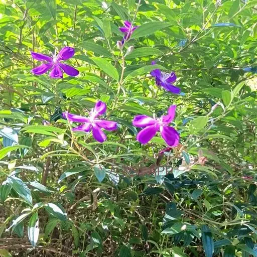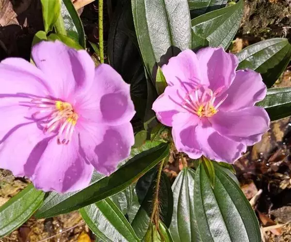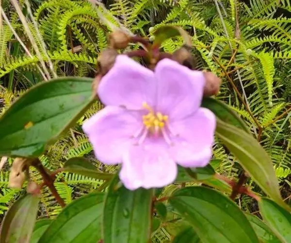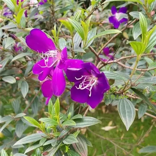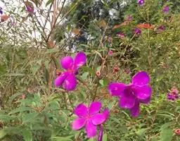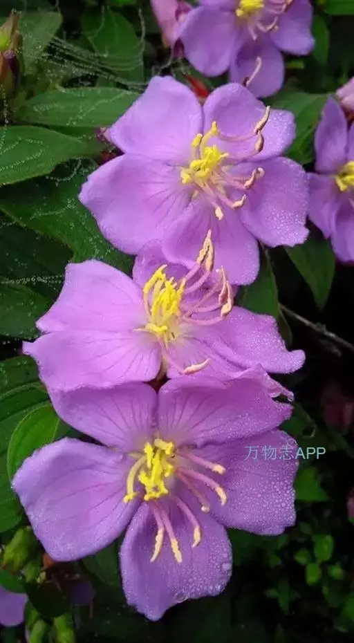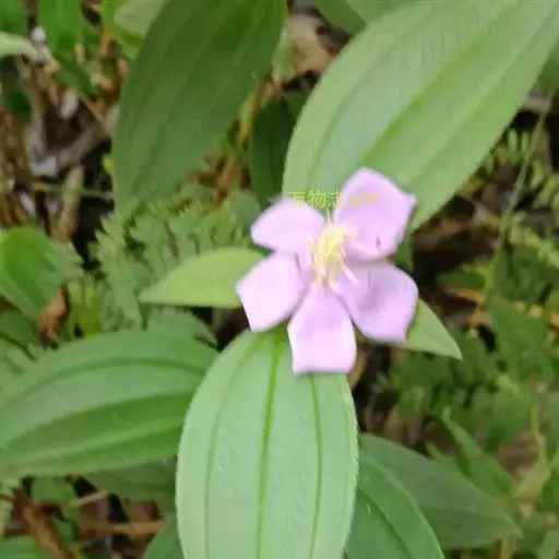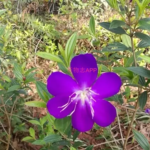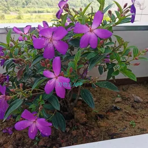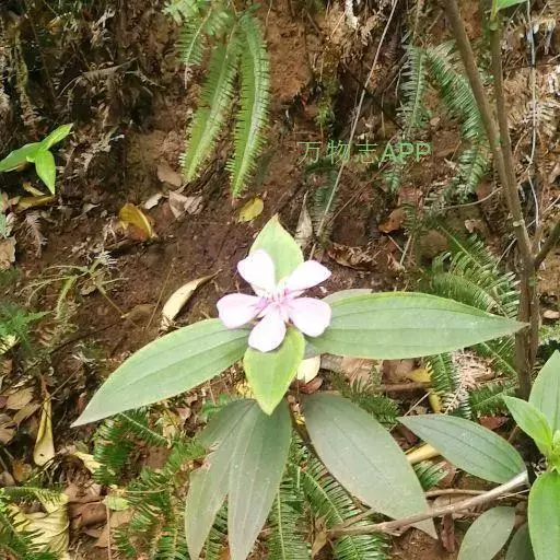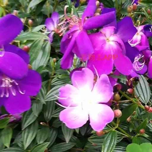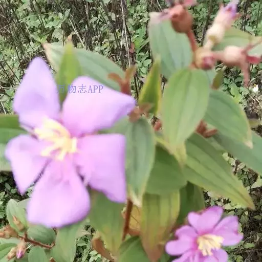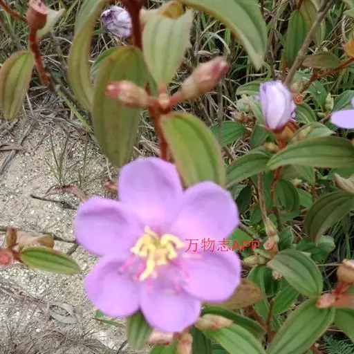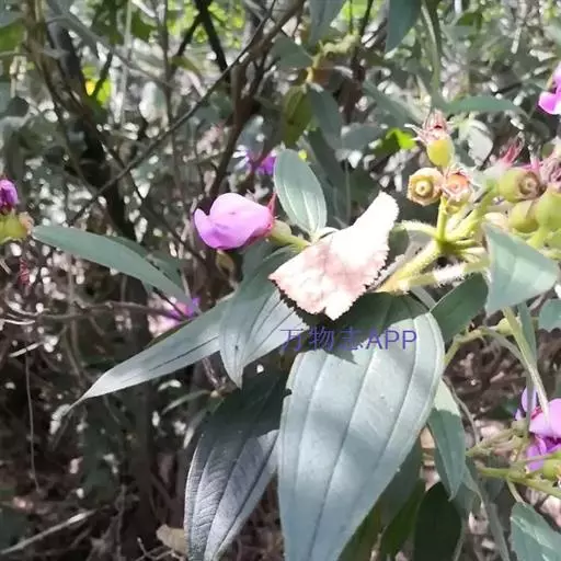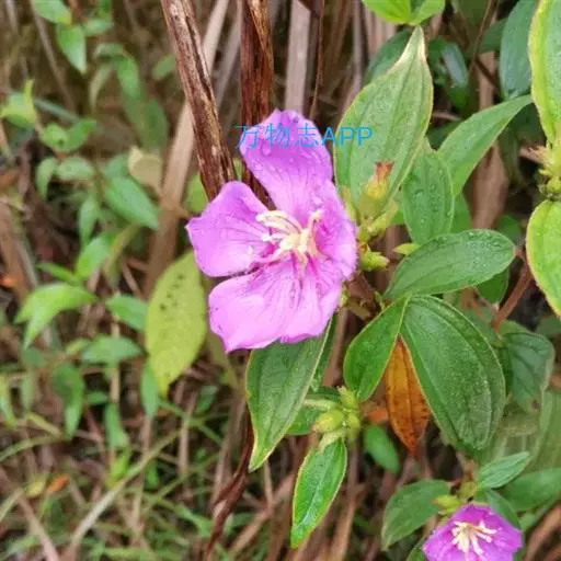 野牡丹(学名:Melastoma candidum D. Don):灌木,高0.5-1.5米,分枝多;茎钝四棱形或近圆柱形,毛扁平边缘流苏状。叶片坚纸质,卵形或广卵形,全缘,7基出脉,两面被糙伏毛及短柔毛。伞房花序生于分枝顶端,近头状,有花3-5朵;花瓣玫瑰红色或粉红色,倒卵形,长3-4厘米,顶端圆形,密被缘毛。蒴果坛状球形,与宿存萼贴生,长1-1.5厘米,直径8-12毫米,密被鳞片状糙伏毛;种子镶于肉质胎座内。花期5-7月,果期10-12月。