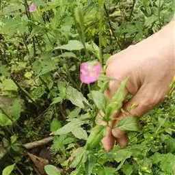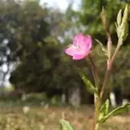 花单生于茎、枝顶部叶腋,近早晨日出开放;花蕾绿色,锥状圆柱形,长1.5-2.2厘米,顶端萼齿紧缩成喙;花管淡红色,长5-8毫米,被曲柔毛,萼片绿色,带红色,披针形,长6-9毫米,宽2-2.5毫米,先端萼齿长1-1.5毫米,背面被曲柔毛,开花时反折再向上翻;花瓣粉红至紫红色,宽倒卵形,长6-9毫米,宽3-4毫米,先端钝圆,具4-5对羽状脉;花丝白色至淡紫红色,长5-7毫米;花药粉红色至黄色,长圆状线形,长约3毫米,花粉约50%发育;子房花期狭椭圆状,长约8毫米,连同花梗长6-10毫米,密被曲柔毛;花柱白色,长8-12毫米,伸出花管部分长4-5毫米;柱头红色,围以花药,裂片长约2毫米,花粉直接授在裂片上。
