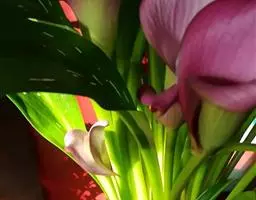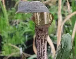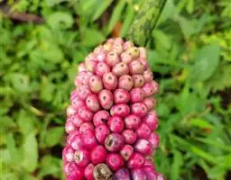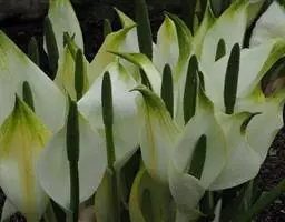 花序柄近圆柱形,常5-8枚并列于同一叶柄鞘内,先后抽出,长30-80厘米,粗1-2厘米,每一花序柄围以1枚鳞叶;鳞叶膜质,披针形,渐尖,长与花序柄近相等,展平宽3厘米,背部有2条棱凸。佛焰苞长12-24厘米:管部绿色,椭圆状,长3-6厘米,粗1.5-2厘米,席卷;檐部长8-19厘米,粉白色,长圆形或椭圆状长圆形,基部兜状,舟形展开,直径2-3厘米,锐尖,直立。肉穗花序长9-20厘米,雌花序圆锥状,奶黄色,基部斜截形;不育雄花序长圆锥状,长3-4.5厘米,下部粗1-2厘米;能育雄花序长5-14厘米,雄花棱柱状,长4毫米,雄蕊4,药室长圆柱形。附属器极短小,锥状,长1-5毫米。浆果圆柱形,长5毫米,种子多数,纺锤形,有多条明显的纵棱。花期4-6月,果9月成熟。