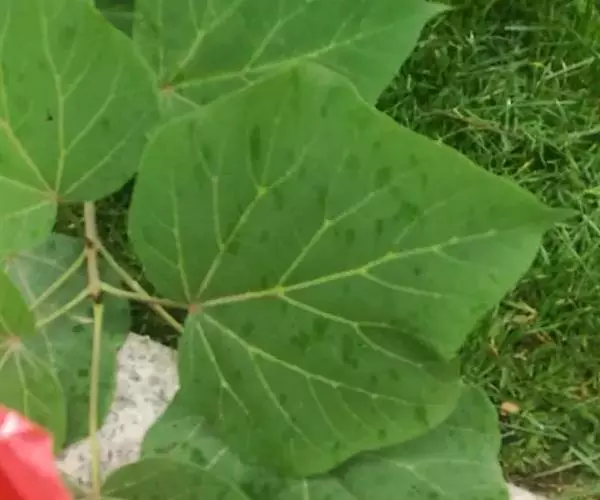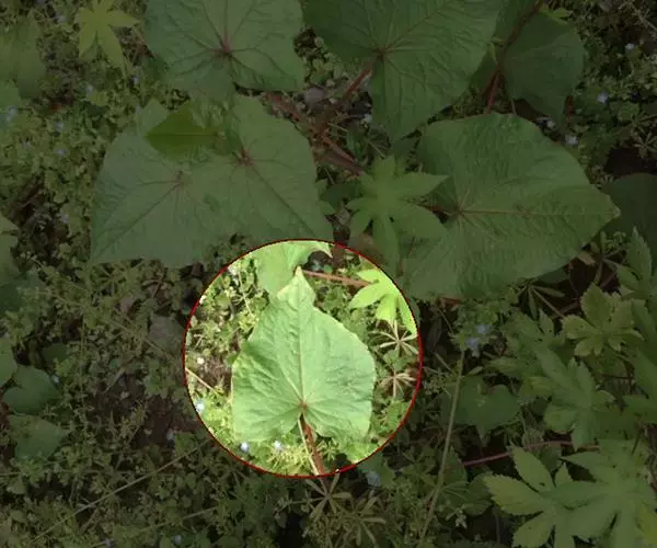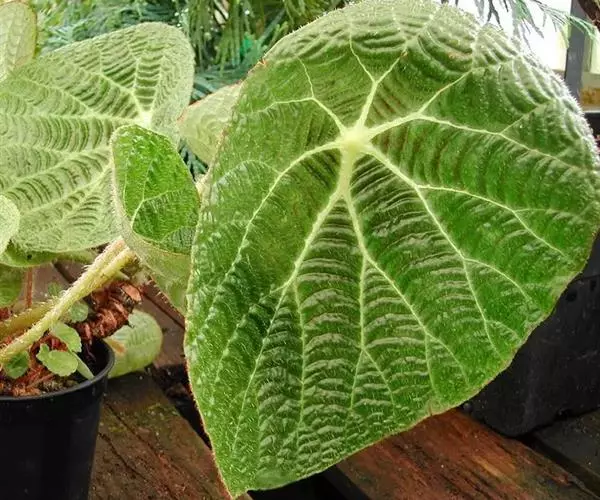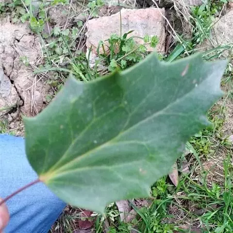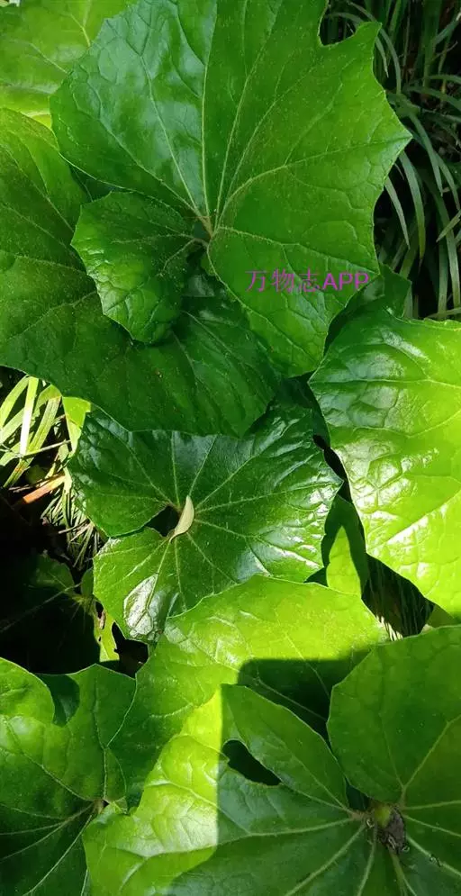 11-17 多年生常绿草本,根茎倒圆锥形,粗3-5(-9)厘米,长5-10厘米,直立。叶丛生,叶柄淡绿色,具白粉,长可达1.5米,下部1/2鞘状,闭合;叶片长圆状心形、卵状心形,长可达1.3米,宽可达1米,有时更大,边缘波状,后裂片圆形,裂弯开展。