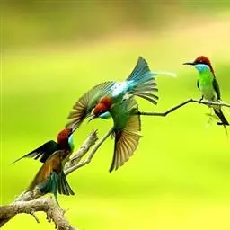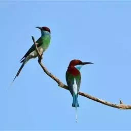 蓝颊蜂虎(学名:Merops persicus):共有2个亚种。体长27-33厘米,翼展46-49厘米,体重38-50克。嘴形细长而下弯,先端尖,嘴峰有棱脊;鼻孔裸露;初级飞羽10片;尾羽12片;体羽质密、正常且无纵纹;尾凸形,中央尾羽特形延长且端部形狭或尖削,脚细弱,中趾与外趾至少连结至基部第二个关节,与内趾则仅于基部的第一个关节并连;翅长而尖,第一片飞羽细小,第二片最长。羽色艳丽,颊蓝绿色显著,两性相似,幼鸟似成鸟。