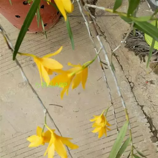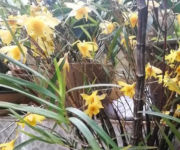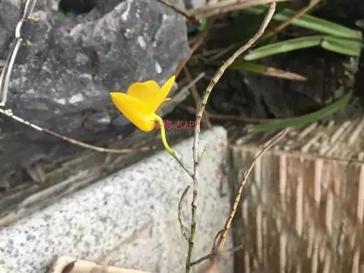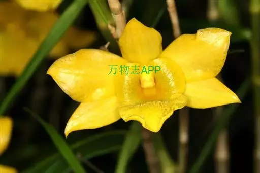 细叶石斛(学名:Dendrobium hancockii Rolfe):茎直立,质地较硬,圆柱形或有时基部上方有数个节间膨大而形成纺锤形,通常分枝,具纵槽或条棱。叶通常3-6枚,互生于主茎和分枝的上部,狭长圆形。总状花序长1-2.5厘米,具1-2朵花,花质地厚,稍具香气,开展,金黄色,仅唇瓣侧裂片内侧具少数红色条纹;花瓣斜倒卵形或近椭圆形,与中萼片等长而较宽,先端锐尖,具7条脉,唇瓣长宽相等,1-2厘米,基部具1个胼胝体,中部3裂。花期5-6月。