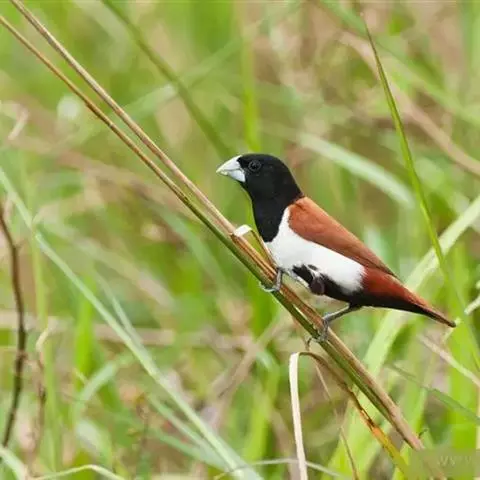 栗腹文鸟:小型鸟类,体长10-12厘米。嘴蓝灰色,基部粗厚,先端尖、呈圆锥状, 脚亦为蓝灰色,整个…