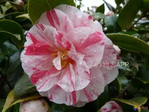 山茶是灌木或小乔木植物,高9米,嫩枝无毛。叶革质,椭圆形,长5-10厘米,宽2.5-5厘米,先端略尖,或急短尖而有钝尖头,基部阔楔形,上面深绿色,干后发亮,无毛,下面浅绿色,无毛,侧脉7-8对,在上下两面均能见,边缘有相隔2-3.5厘米的细锯齿。叶柄长8-15毫米,无毛。
