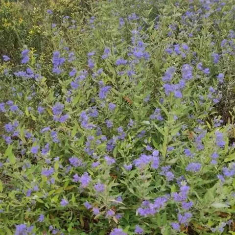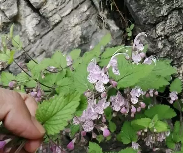 单花莸,为马鞭草科、莸属。多年生蔓性草本,茎基部木质化,枝四方形。叶对生,叶边缘具4~6对钝锯齿,两面被柔毛和腺点。花单生叶腋,5中裂,蓝白色,有紫色条纹和斑点,雄蕊与花柱均伸出花筒外。花期4~8月。