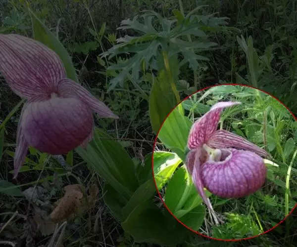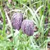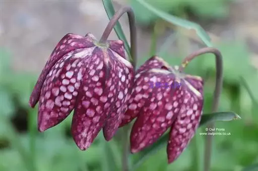 花1-3朵,紫色而具黄色小方格,顶端的花具4-6枚叶状苞片,苞片先端强烈卷曲;外花被片长约3.5厘米,宽约1.5厘米,比内花被片稍长而宽;蜜腺窝在背面明显凸出;雄蕊长约为花被片的3/5,花药近基着,花丝具小乳突,上部更多;花柱也有乳突,柱头裂片长约5毫米。花期5-6月。