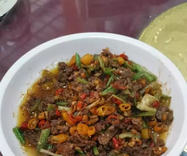 热锅冷油,加入大蒜生姜煸锅油炒香以后,牛肉下锅快速翻炒,肉变色以后盛起来,红尖椒、野山椒下锅,炒出香味以后,牛肉再下锅,一起快速翻炒