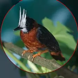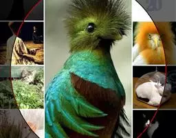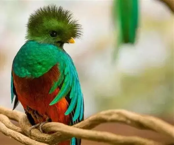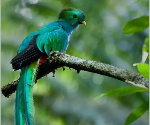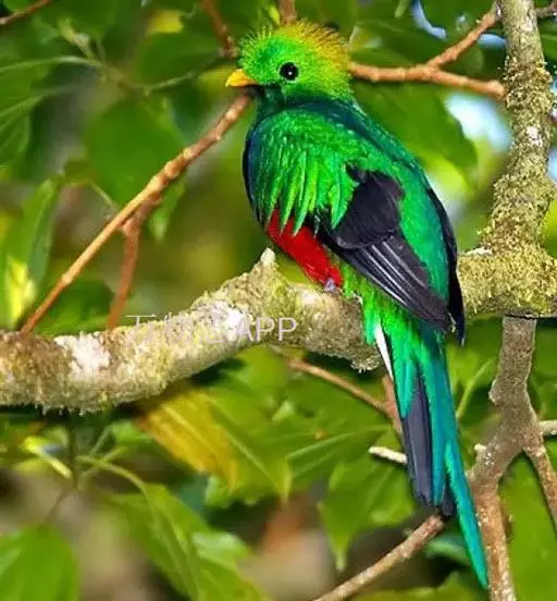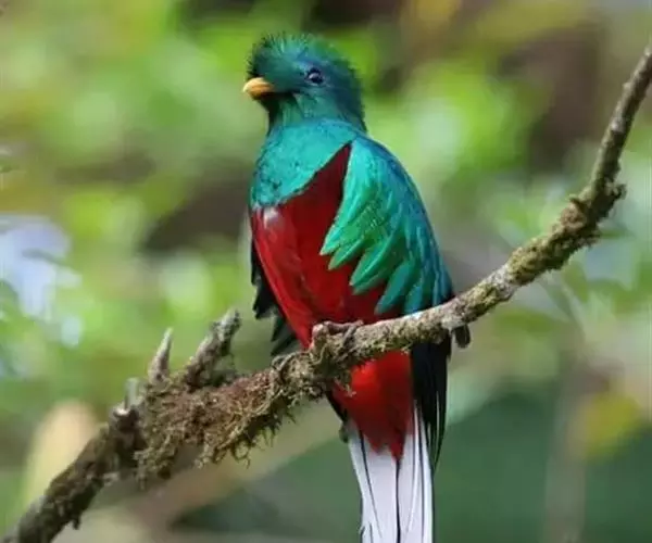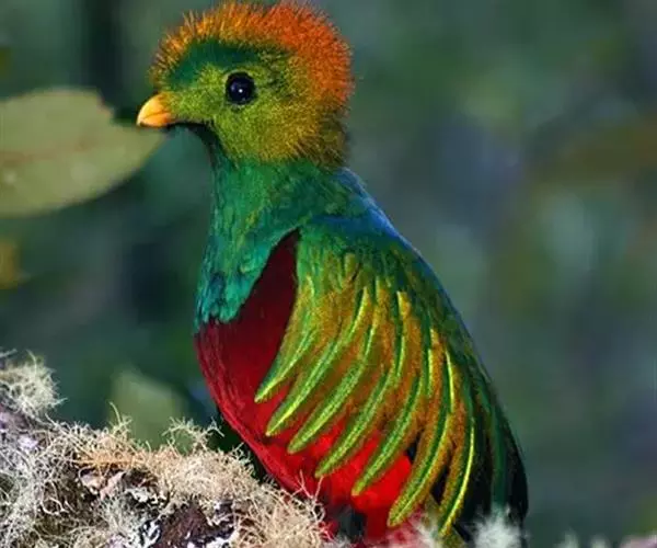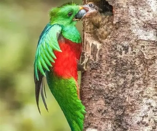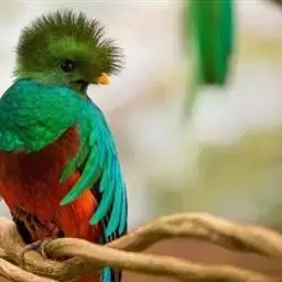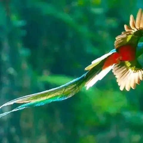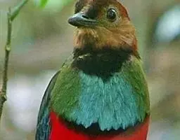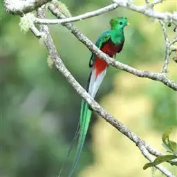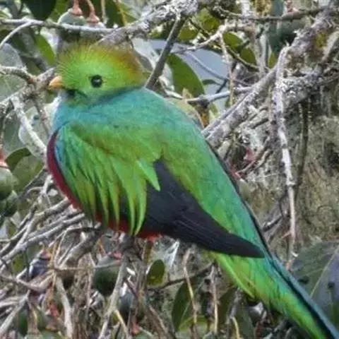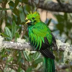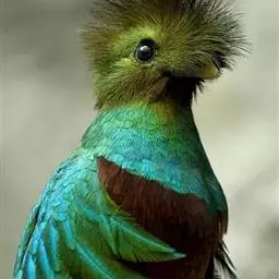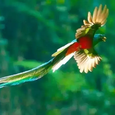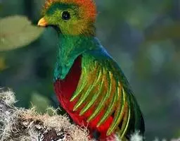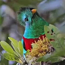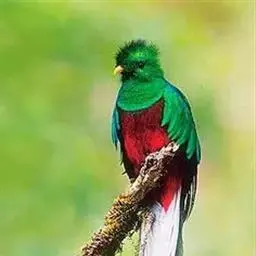 绿咬鹃(分布从墨西哥南部至玻利维亚)是古代马雅人和阿兹特克人的圣鸟;其形象见于危地马拉的国徽;该国货币名格查尔(quetzal),意即绿咬鹃。该物种尾羽长而呈蓝绿色(飞行时尾的下部呈白色)。头具圆形发状羽冠,胸金绿色,背蓝色,翕羽卷曲而带金黄色泽,腹部红色。