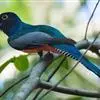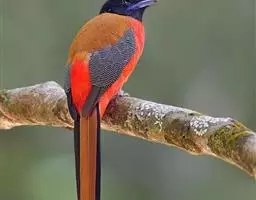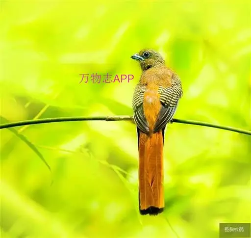 橙胸咬鹃:全长约28厘米。雄鸟头、颈橄榄绿色,上体及中央尾羽栗色;中央尾羽具黑色端,…