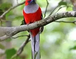 红头咬鹃: 体大,体长约33厘米,体重75-110克。头、颈暗绯红色;背、肩锈褐色。两翅黑色,…