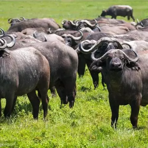 非洲野水牛:共有5个亚种。头体长2.1-3.4米,身高1-1.7米,体重300-900千克。胸膛宽…