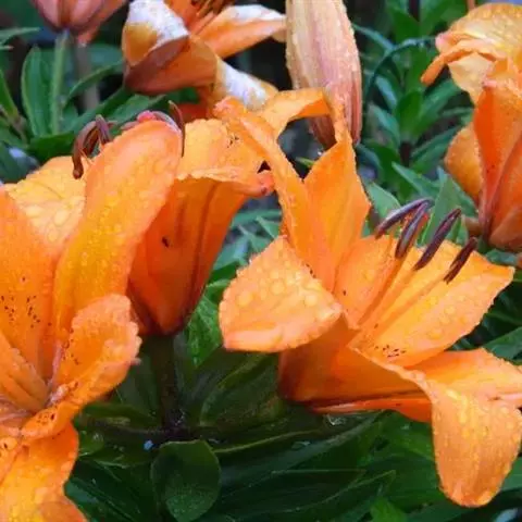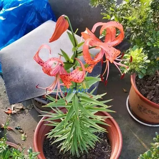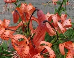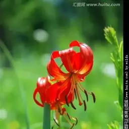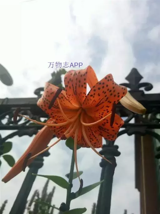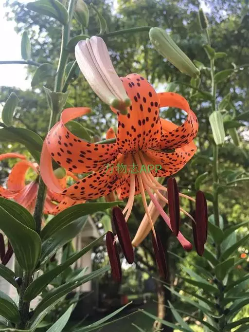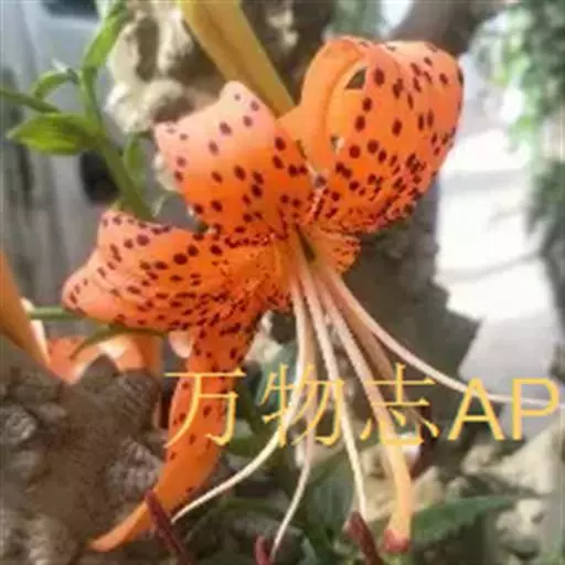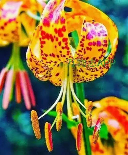 卷丹(学名:Lilium lancifolium Thunb.):卷丹花瓣有平展的,有向外翻卷的,故有“卷丹”美名。鳞茎近宽球形,高约3.5厘米,直径4-8厘米;鳞片宽卵形,长2.5-3厘米,宽1.4-2.5厘米,白色。茎高0.8-1.5米,带紫色条纹,具白色绵毛。叶散生,矩圆状披针形或披针形,两面近无毛,有5-7条脉。花3-6朵或更多;苞片叶状,卵状披针形;花下垂,花被片披针形,反卷,橙红色,有紫黑色斑点。蒴果狭长卵形,长3-4厘米。花期7-8月,果期9-10月。