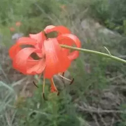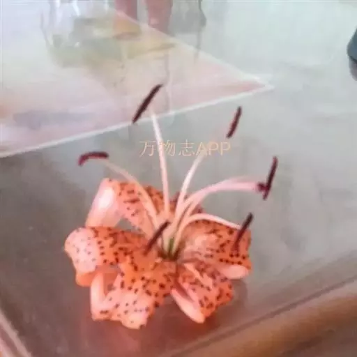 花3-6朵或更多;苞片叶状,卵状披针形,长1.5-2厘米,宽2-5毫米,先端钝,有白绵毛;花梗长6.5-9厘米,紫色,有白色绵毛;花下垂,花被片披针形,反卷,橙红色,有紫黑色斑点;外轮花被片长6-10厘米,宽1-2厘米;内轮花被片稍宽,蜜腺两边有乳头状突起,尚有流苏状突起;雄蕊四面张开;花丝长5-7厘米,淡红色,无毛,花药矩圆形,长约2厘米;子房圆柱形,长1.5-2厘米,宽2-3毫米;花柱长4.5-6.5厘米,柱头稍膨大,3裂。