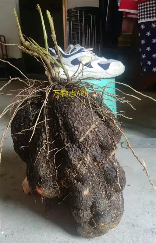 藤本植物,粗壮,长可达20米左右。块茎一般生长在表土层,为卵形、球形、长圆形或葫芦状,外皮黑褐色,凹凸不平,断面新鲜时红色,干后紫黑色,直径大的甚至可达20多厘米。茎绿色,无毛,右旋,有分枝,下部有刺。