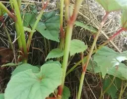 多年生草本。根状茎近球形,直径8-20毫米,具密集而交织的细长纤维状之根。茎直立,有分枝,高40-60厘米,有纵棱,近无毛。基生叶未见。茎生叶互生,具长柄;叶片两侧不相等,轮廓宽卵形至卵形,长10-18厘米,宽7-14厘米,先端渐尖至长渐尖,基部心形,偏斜,窄侧宽1.6-4厘米,宽侧向下延伸长达3-6.5厘米,宽4-8厘米,边缘具不等大的三角形浅齿,齿尖带短芒,并常呈波状或宽三角形的极浅齿,在宽侧出现较多,上面褐绿色,常有红晕,幼时散生硬毛,逐渐脱落,老时近无毛,下面色淡,带红晕或紫红色,沿脉散生硬毛或近无毛,掌状7(-9)条脉,带紫红色,窄侧常2(-3)条,宽侧3-4(-5)条,近中部分枝,呈羽状脉;叶柄长4-13.5厘米,有棱,近无毛;托叶膜质,长圆形至披针形,长约10毫米,宽约2-4毫米,先端渐尖,早落。