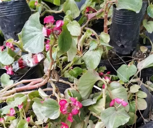 由腐霉菌(Pythiumsplendens)引起的秋海棠根腐病症状:感染这种病菌后,扦插苗的根系弱、叶片发黄。诊断方法是茎部和根系出现黑色的糊状物,从插条的基部可以一直蔓延到茎和叶片的部。根部和茎段的腐烂经常是成片发生,而通过栽植床,很容易将病菌传染给健康的插条。