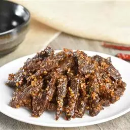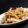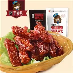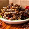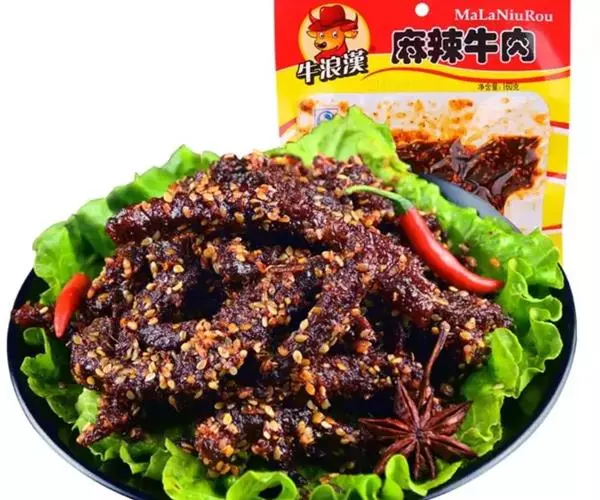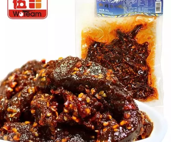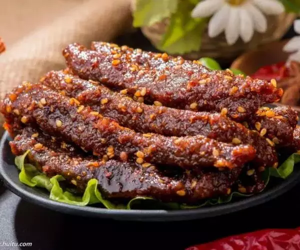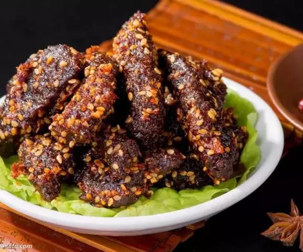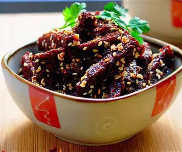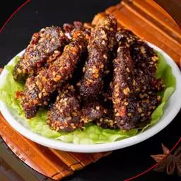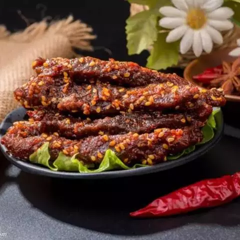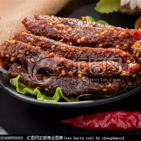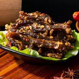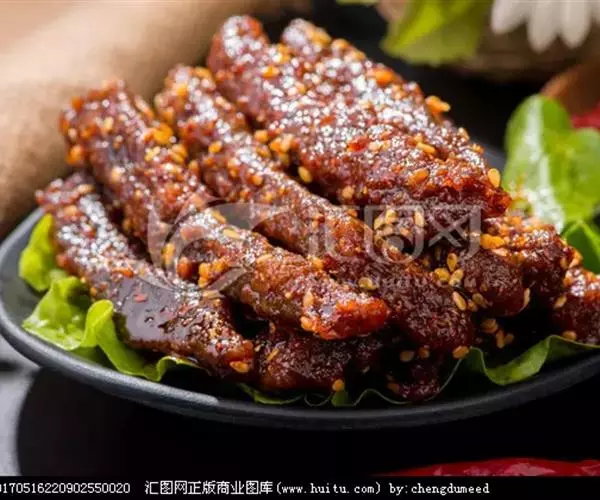 色泽红亮,质地干香酥脆,麻辣味厚,为喝酒佳品。