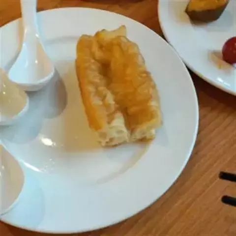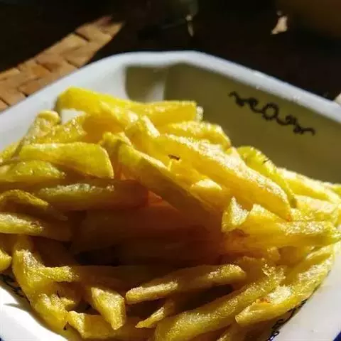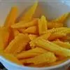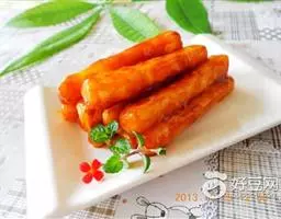 2.将牛肉切成条,沾淀粉下锅炸,捞出控油