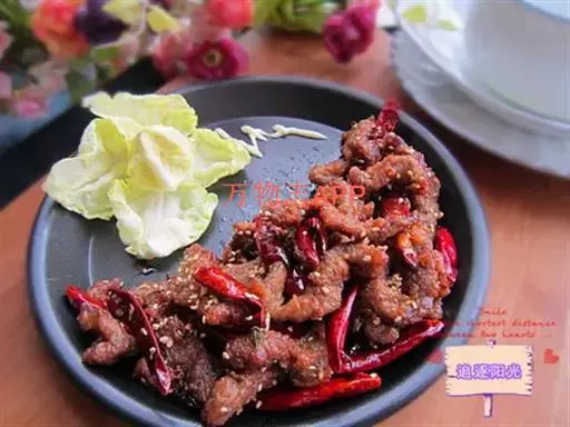 3.锅中加油,下花椒、干辣椒、葱姜煸出香味,放入牛肉条爆炒,加盐、白糖、辣椒油爆炒。加入芝麻,翻炒均匀后即可出锅。
