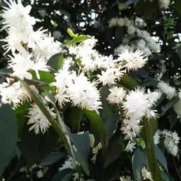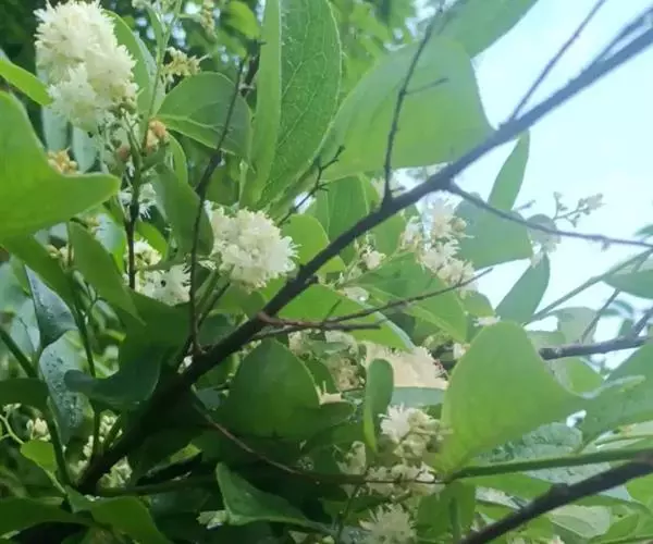 圆锥花序长5-8厘米,通常有柔毛;苞片早落,通常条形,有褐色腺点;花萼长2-3毫米,萼筒褐色,无毛或有疏柔毛,裂片半圆形或卵形,稍长于萼筒,淡黄色,有纵脉纹,边缘有毛;花冠白色,长4-5毫米,5深裂几达基部;雄蕊40-60枚,子房2室,花盘具5凸起的腺点。