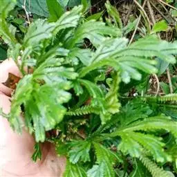 1、卷柏:本品卷缩似拳状,长3~10cm。枝丛生,扁而有分枝,绿色或棕黄色,向内卷曲,枝上密生鳞片状小叶,叶先端具长芒。中叶(腹叶)两行,卵状矩圆形,斜向上排列,叶缘膜质,有不整齐的细锯齿;背叶(侧叶)背面的膜质边缘常呈棕黑色。基部残留棕色至棕褐色须根,散生或聚生成短干状。质脆,易折断。气微,味淡。