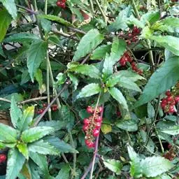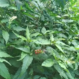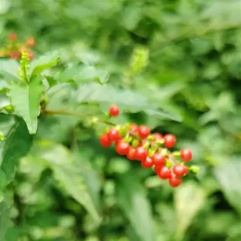 蕾芬,别名数珠珊瑚、小商陆、胭脂草, 半灌木,高30-100厘米。茎直立,枝开展,幼时被短柔毛。
