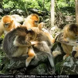 川金丝猴 金丝猴是典型的森林树栖动物,常年栖息于海拔1500~3300m的森林中。其植被类型和垂直分布带属亚热带山地常绿、落叶阔叶混交林、亚热带落叶阔叶林和常绿针叶林以及次生性的针阔叶混交林等四个植被类型,随着季节的变化,它们不向水平方向迁移,只在栖息的生境中作垂直移动。群栖生活,每个大的集群是按家族性的小集群为活动单位。每个小家族集群又由一强健的成年雄体为首领猴和3~5只雌猴及3岁以下的幼猴和哺乳的仔猴所组成。