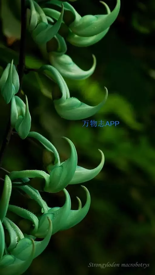 翡翠葛(Strongylodon macrobotrys A. Gray)又名碧玉藤,蝶形花科碧玉藤属木质藤本。花序悬垂,盛放时宛如一串串栖息于藤中林下的小鸟,生机盎然,惹人怜爱。花碧玉色透蓝色光泽,在阳光的照耀下,如翡翠般晶莹剔透,美得摄人心魄。含苞的酷似翡翠象牙,盛开的如同翡翠雕琢而成的金刚鹦鹉的喙,弯弯上翘的龙骨瓣甚张扬。