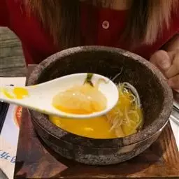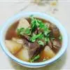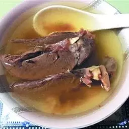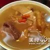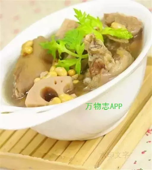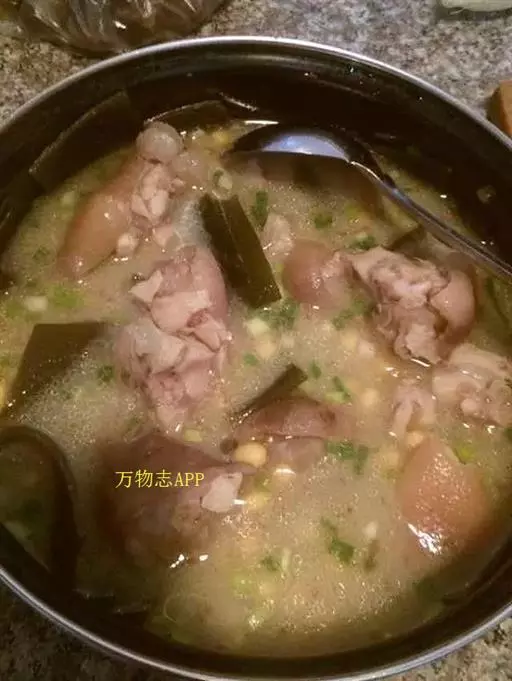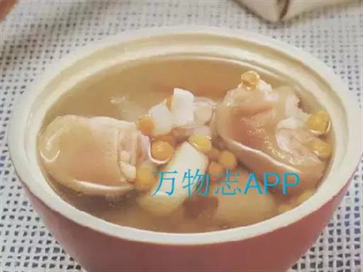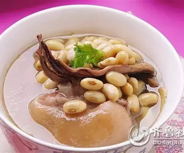 ②加绍酒、葱及用清水浸泡过1小时的黄豆,中火35分钟,加盐、味精调味,再高火15分钟即可。