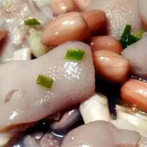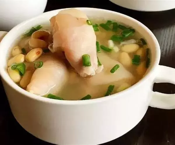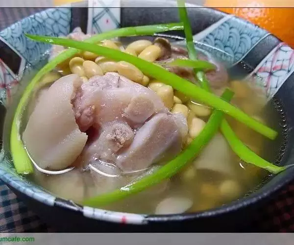 猪蹄用沸水烫后拔净毛,刮起去浮皮;把黄豆提前浸泡1小时,备用;姜洗净切片;大葱切段;猪蹄内加入清水、姜片煮沸,撇沫;加上酒、葱及黄豆,加盖,用文火焖煮;至半酥,加精盐,再煮1小时;调入味精,即可。