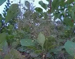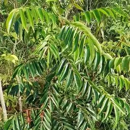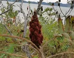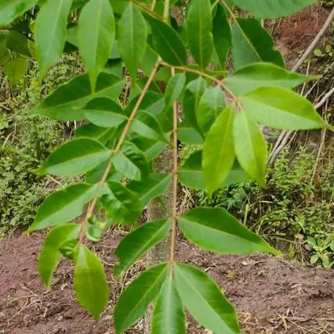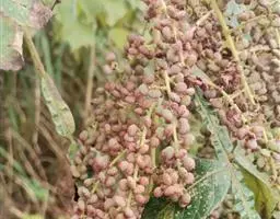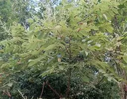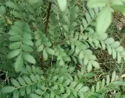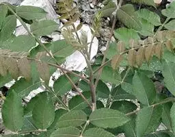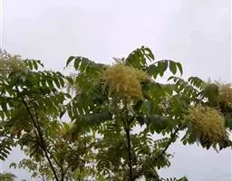 木蜡树 落叶乔木或小乔木,高达10米;幼枝和芽 被黄褐色绒毛,树皮灰褐色。奇数羽状复叶互生,有小叶3-6对,稀7对,叶轴和叶柄圆柱形,密被黄褐色绒毛;叶柄长4-8厘米;小叶对生,纸质,卵形或卵状椭圆形或长圆形,长4-10厘米,宽2-4厘米,先端渐尖或急尖,基部不对称,圆形或阔楔形,全缘,叶面中脉密被卷曲微柔毛,其余被平伏微柔毛,叶背密被柔毛或仅脉上较密,侧脉15-25对,两面突起,细脉在叶背略突;小叶无柄或具短柄。圆锥花序长8-15厘米,密被锈色绒毛,总梗长1.5-3厘米;花黄色,花梗长1.5毫米,被卷曲微柔毛;花萼无毛,裂片卵形,长约0.8毫米,先端钝;花瓣长圆形,长约1.6毫米,具暗褐色脉纹,无毛;雄蕊伸出,花丝线形,长约1.5毫米,花药卵形,长约0.5毫米,无毛,在雌花中雄蕊较短,花丝钻形;花盘无毛;子房球形,径约1毫米,无毛。核果极偏斜,压扁,先端偏于一侧,长约8毫米,宽6-7毫米,外果皮薄,具光泽,无毛,成熟时不裂,中果皮蜡质,果核坚硬。