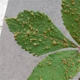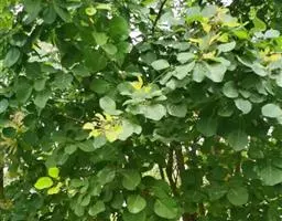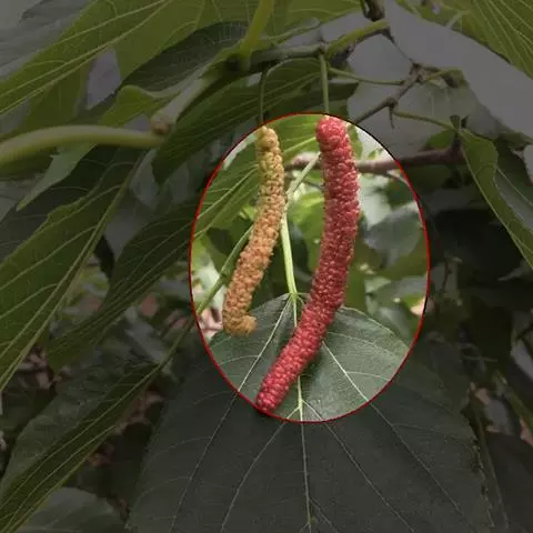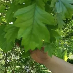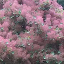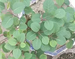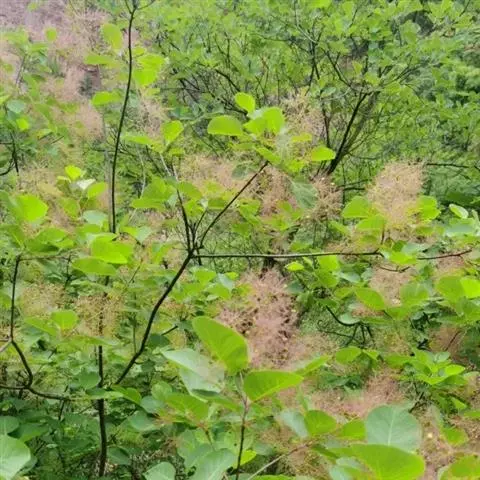 粉背黄栌叶卵圆形,较大,长3.5-10厘米,宽2.5-7.5厘米,无毛,但叶背显著被白粉;叶柄较长,…