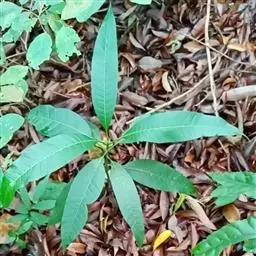 大叶肉托果 叶互生,常集生于小枝顶端,革质,椭圆状披针形或卵状披针形,长25-50厘米,宽5.5-12厘米,先端急尖或短渐尖或短尾尖,基部钝,两面无毛;叶面略具光泽,叶背苍白色,中脉在叶面平或略突,在叶背突起,侧脉约20对,与中脉成70度角,网脉两面突起;叶柄长1-3厘米。圆锥花序顶生,长约17厘米;花白色,花梗短,长约2毫米,苞片三角形,长约1毫米,边缘具细睫毛;花萼钟状,长约2.5毫米,萼齿明显或不明显;花瓣卵状披针形,长约5.5毫米,宽约2.5毫米,先端钝,基部截形;雄蕊与花瓣互生,比花瓣短,花丝线形,长约3毫米,花药长圆形;子房阔卵形,长约2毫米,胚珠悬垂于中上部。核果扁球形,先端偏斜,急尖,长约2.3厘米,宽约2厘米。