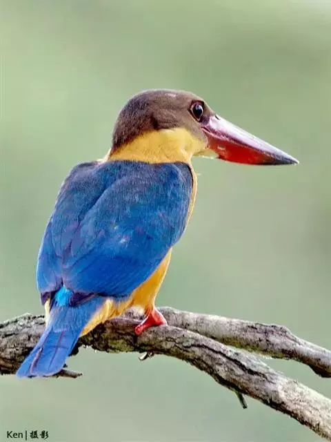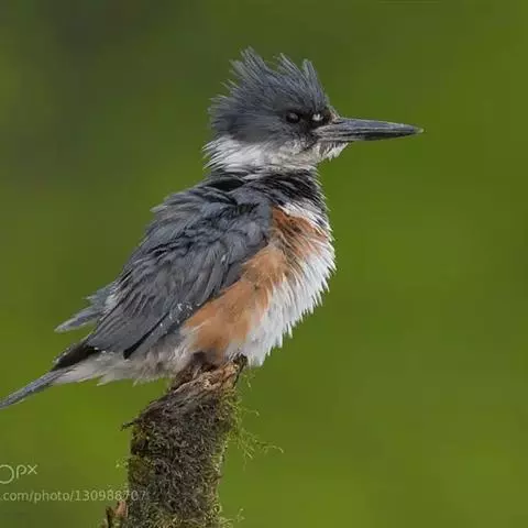 棕腹鱼狗身长38 - 42 cm ,体重305-341 g。主体羽毛蓝色。头顶的冠羽竖起一个小尖峰…
