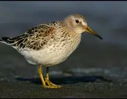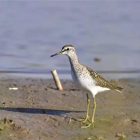 小黄脚鹬(学名:Tringa flavipes):小型涉禽,体长23-25厘米。嘴较细直、黑褐色。脚较长、橙黄色。夏羽头、颈、胸具褐色纵纹,眼周有显著的白色圈,在暗色的头上甚为醒目。肩、背、三级飞羽黑色具白色斑点。腰和尾上覆羽白色,下体亦主要为白色。冬羽上体灰褐色具不清晰的白色斑点,胸灰褐色微具淡色纵纹。