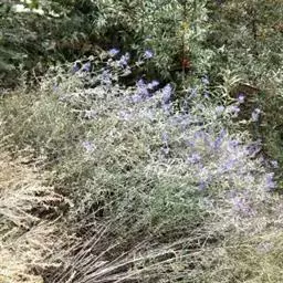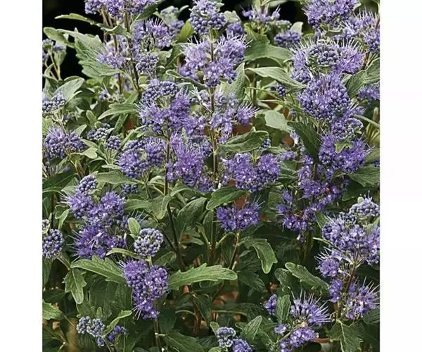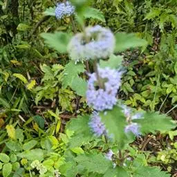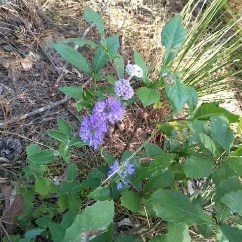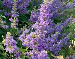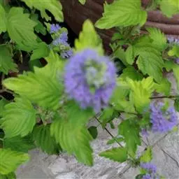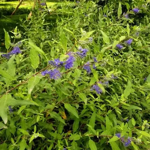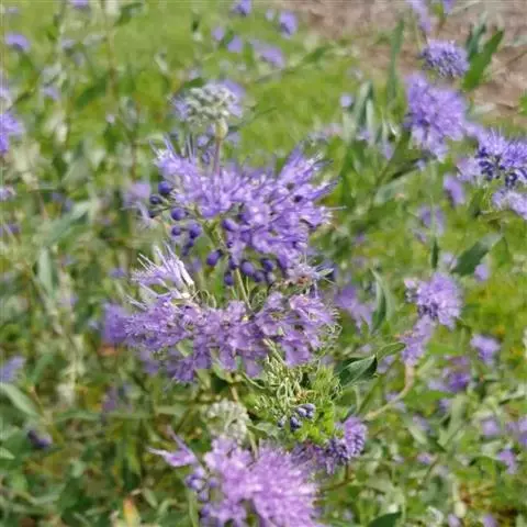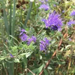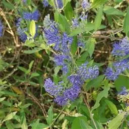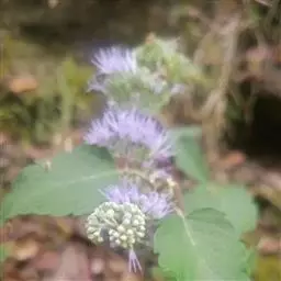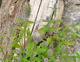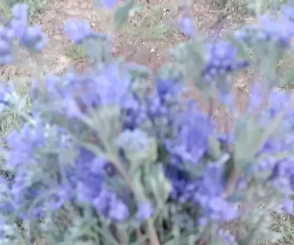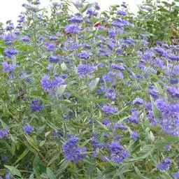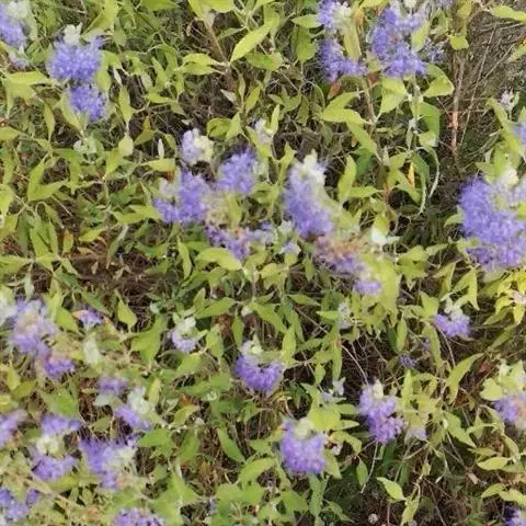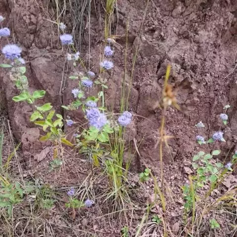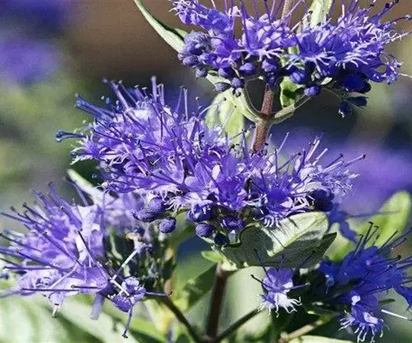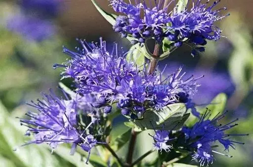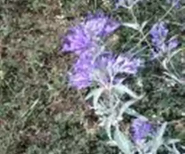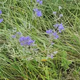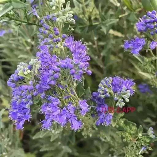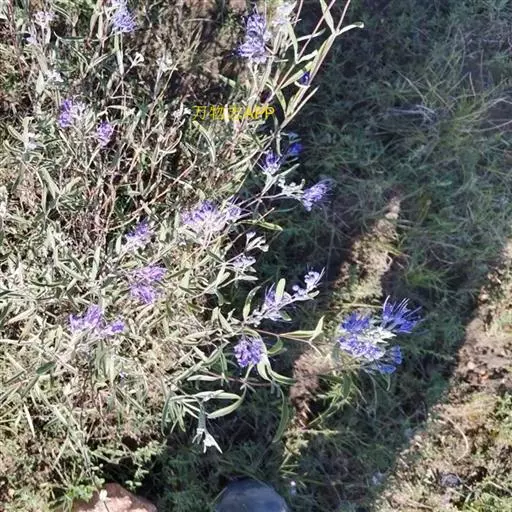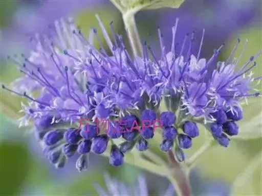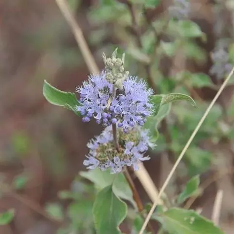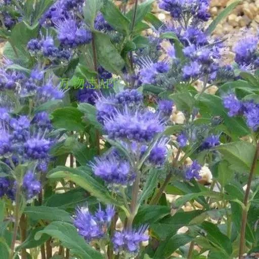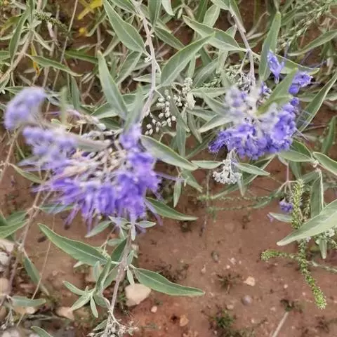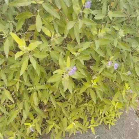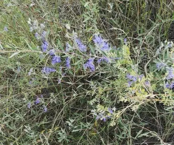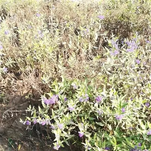 蒙古莸(学名:Caryopteris mongholica Bunge):为马鞭草科莸属落叶小灌木。常自基部即分枝,嫩枝紫褐色,圆柱形,有毛,老枝毛渐脱落。叶片厚纸质,线状披针形或线状长圆形,背面密生灰白色绒毛。聚伞花序腋生,无苞片和小苞片,花萼钟状,花冠蓝紫色。蒴果椭圆状球形,无毛,果瓣具翅。花果期8-10月。