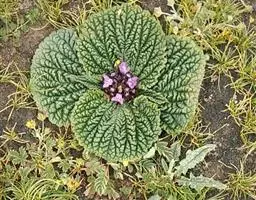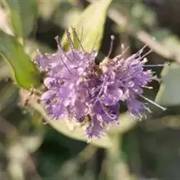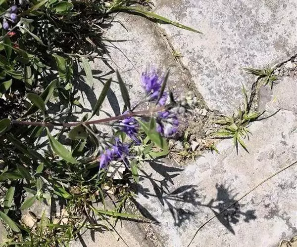 聚伞花序腋生,无苞片和小苞片;花萼钟状,长约3毫米,外面密生灰白色绒毛,深5裂,裂片阔线形至线状披针形,长约1.5毫米;花冠蓝紫色,长约1厘米,外面被短毛,5裂,下唇中裂片较长大,边缘流苏状,花冠管长约5毫米,管内喉部有细长柔毛;雄蕊4枚,几等长,与花柱均伸出花冠管外;子房长圆形,无毛,柱头2裂。蒴果椭圆状球形,无毛,果瓣具翅。花果期8-10月。