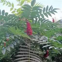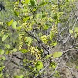 圆锥花序长20-35厘米,多花密集,被灰黄色微柔毛,分枝开展,最基部分枝长6-15厘米;苞片披针形,长约1.5毫米,被微柔毛;花小,杂性,黄色或淡黄色;花梗长1.5-3毫米,具节;萼片卵状披针形,长2.5-3毫米,宽约1.5毫米,渐尖,外面被微柔毛,边缘具细睫毛;花瓣长圆形或长圆状披针形,长3.5-4毫米,宽约1.5毫米,无毛,里面具3-5条棕褐色突起的脉纹,开花时外卷;花盘膨大,肉质,5浅裂;雄蕊仅1个发育,长约2.5毫米,花药卵圆形,不育雄蕊3-4,具极短的花丝和疣状花药原基或缺;子房斜卵形,径约1.5毫米,无毛,花柱近顶生,长约2.5毫米。